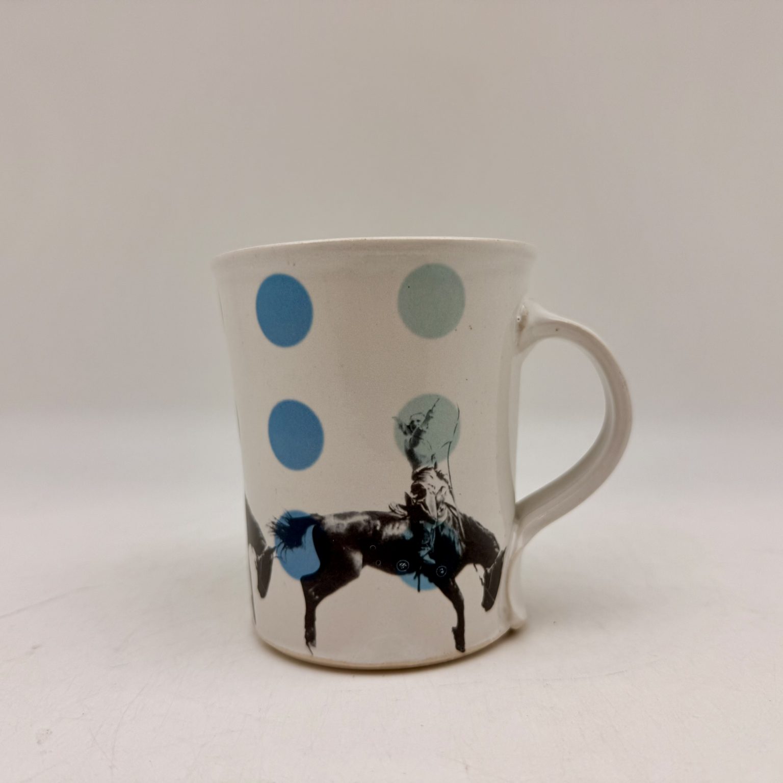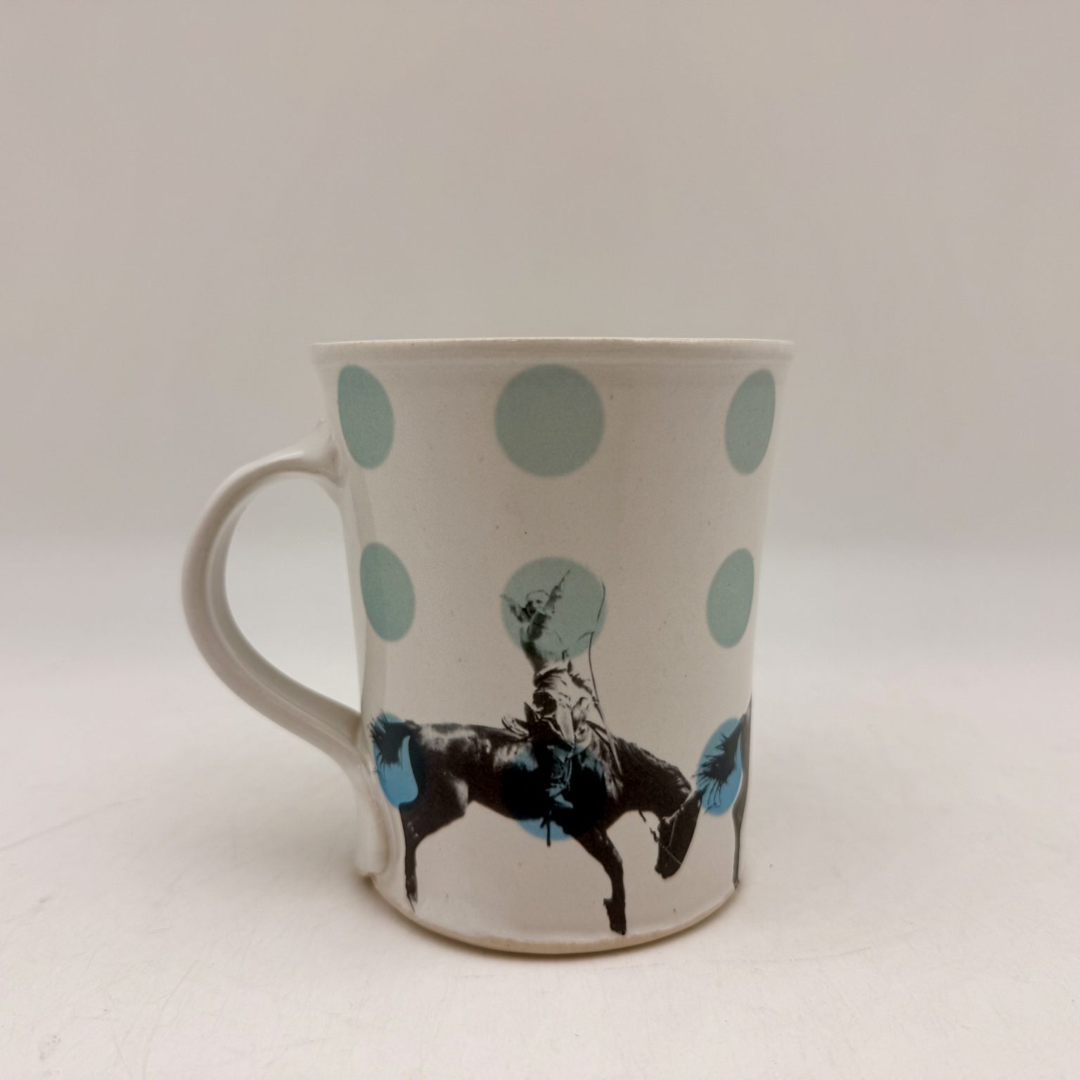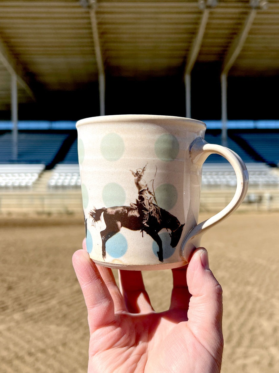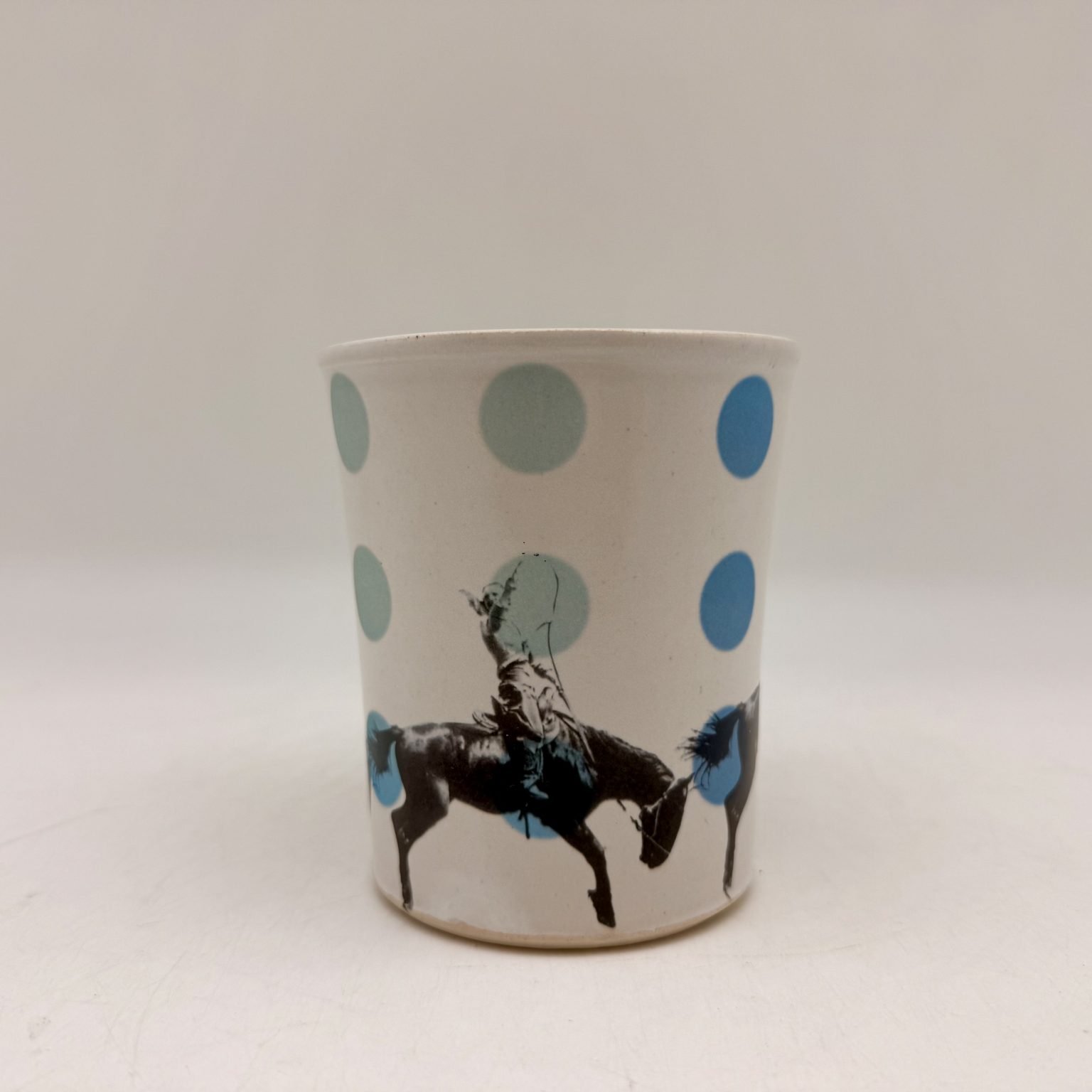 Caught in mid jump! Three jumping cowgirls on a pearl opalescent glaze with an ombre dot pattern that wraps around the mug. The ombre pattern goes from either green to blue, or red to orange. Perfect for any hot toddy or fresh cup of coffee. Height: 4″ Width From Handle: 4.5″ Diameter: 3.75″ Standard 15 oz. coffee mug, give or take an ounce or two as each mug is individually thrown on a potter’s wheel. The measurements and color of each mug may vary slightly.