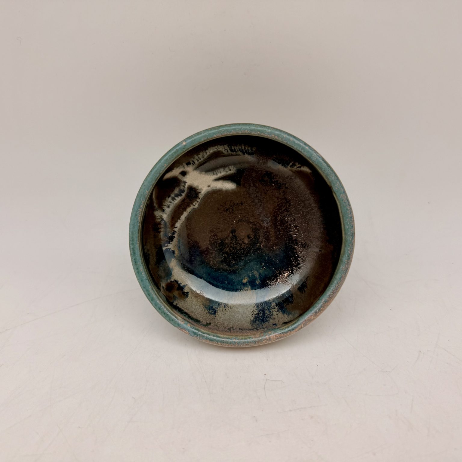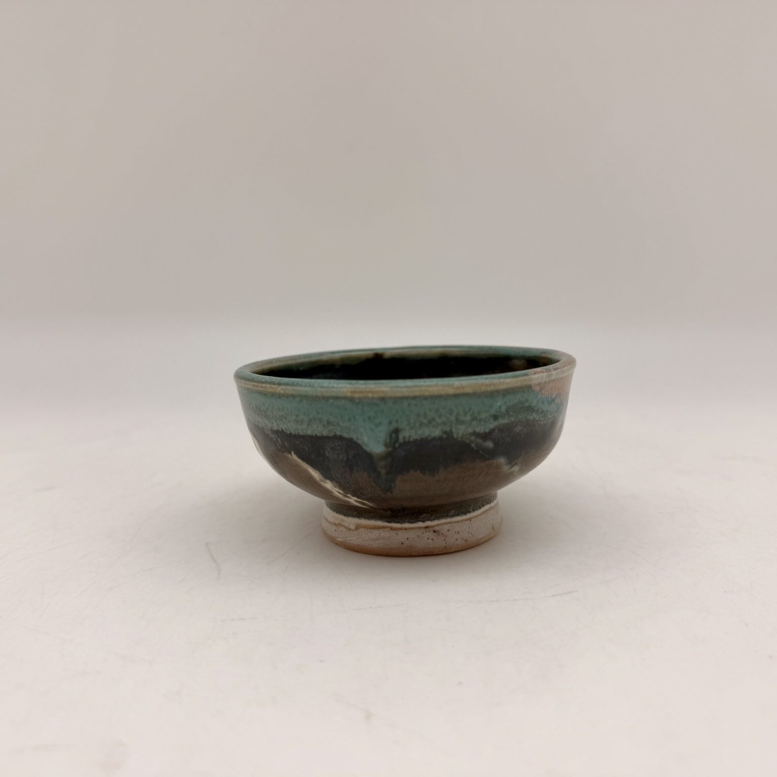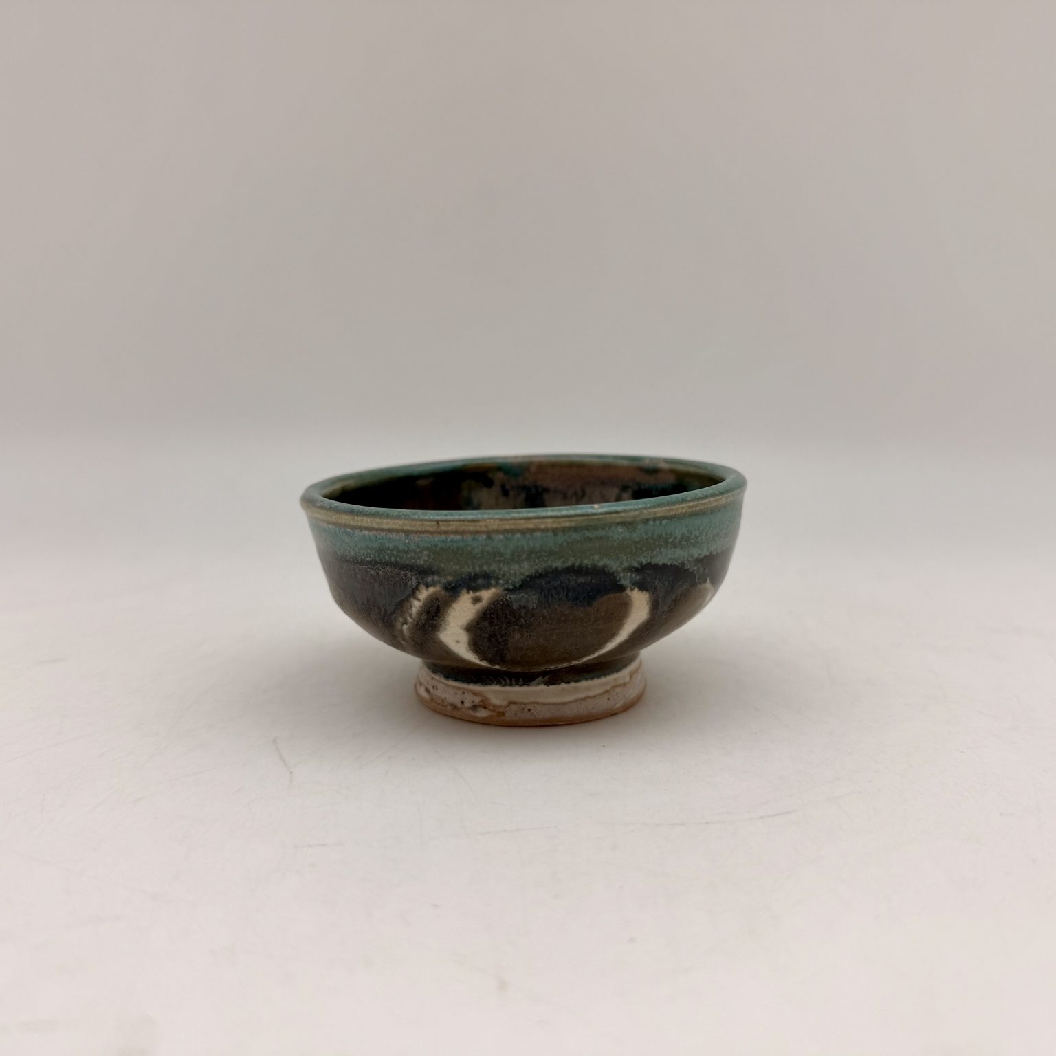 This mini porcelain bowl was hand-thrown by Margo Brown in Buffalo, Wyoming. Height: 1.75″ Diameter: 3.5″ Color: Turquoise, White, Brown Dishwasher safe.