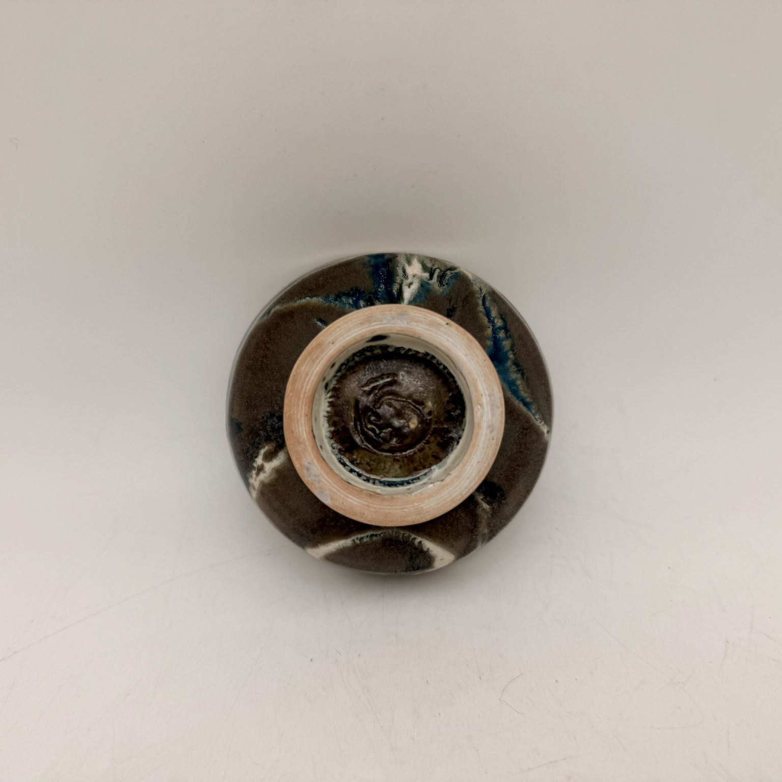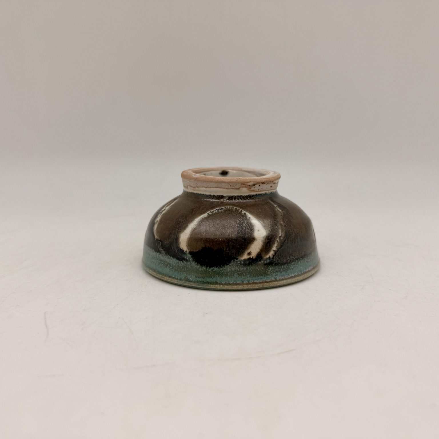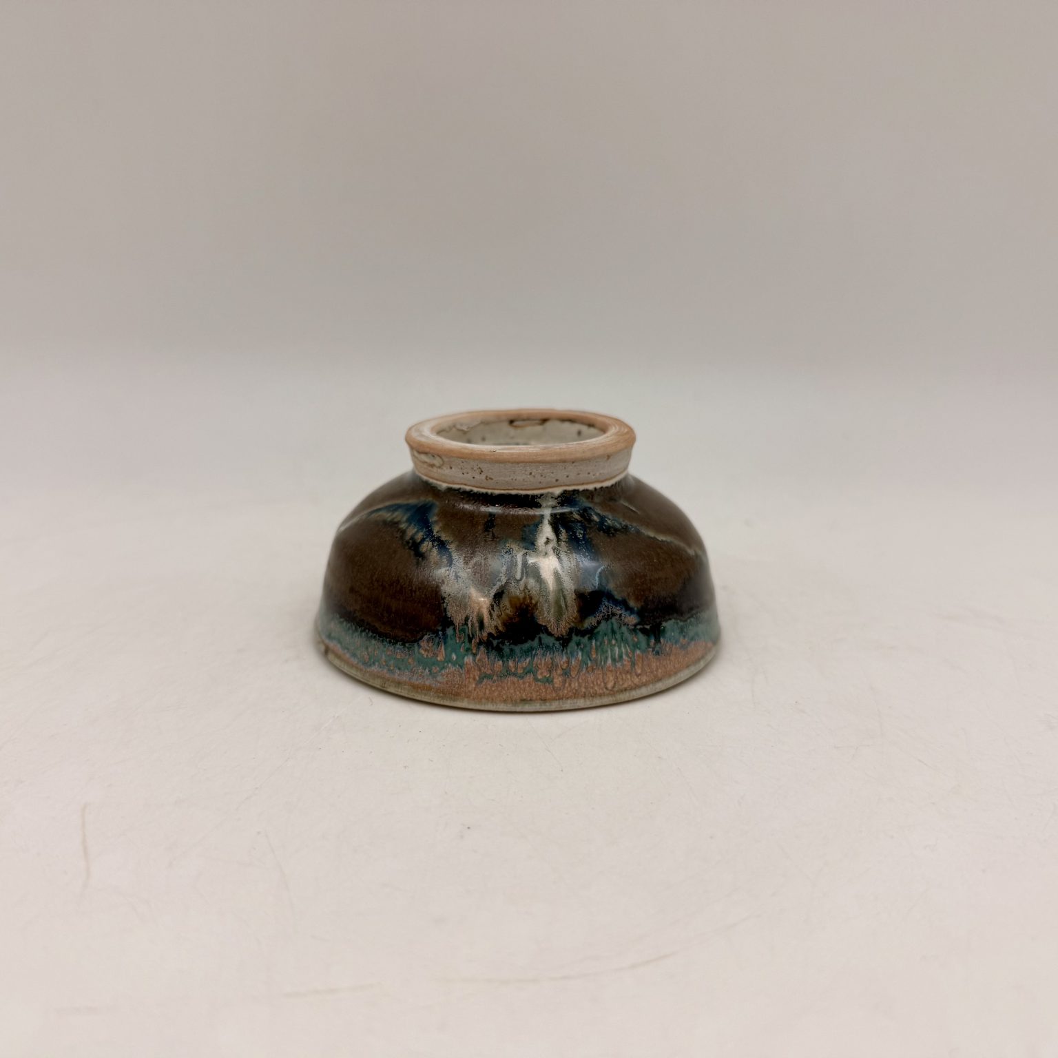 This mini porcelain bowl was hand-thrown by Margo Brown in Buffalo, Wyoming. Height: 1.75″ Diameter: 3.5″ Color: Turquoise, White, Brown Dishwasher safe.