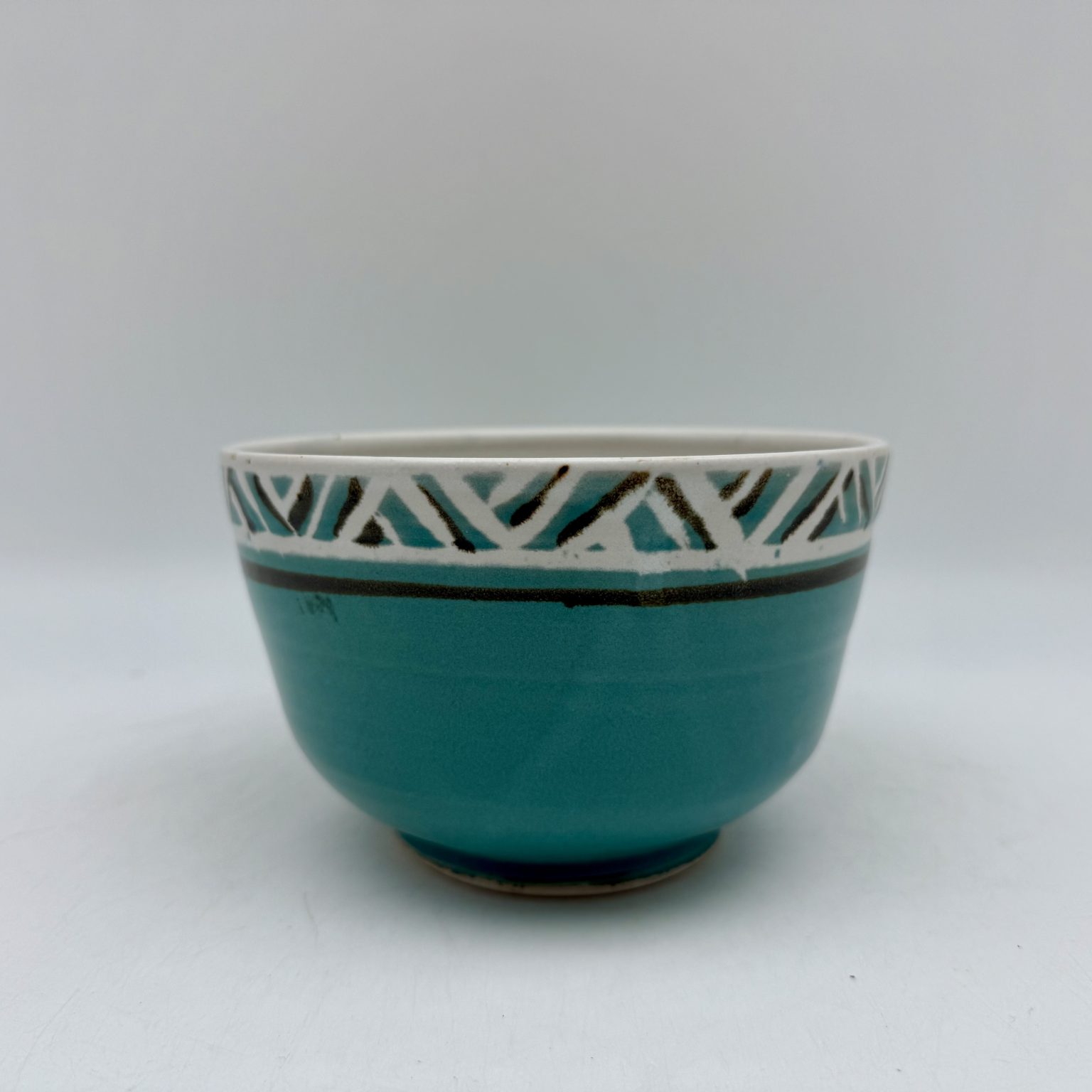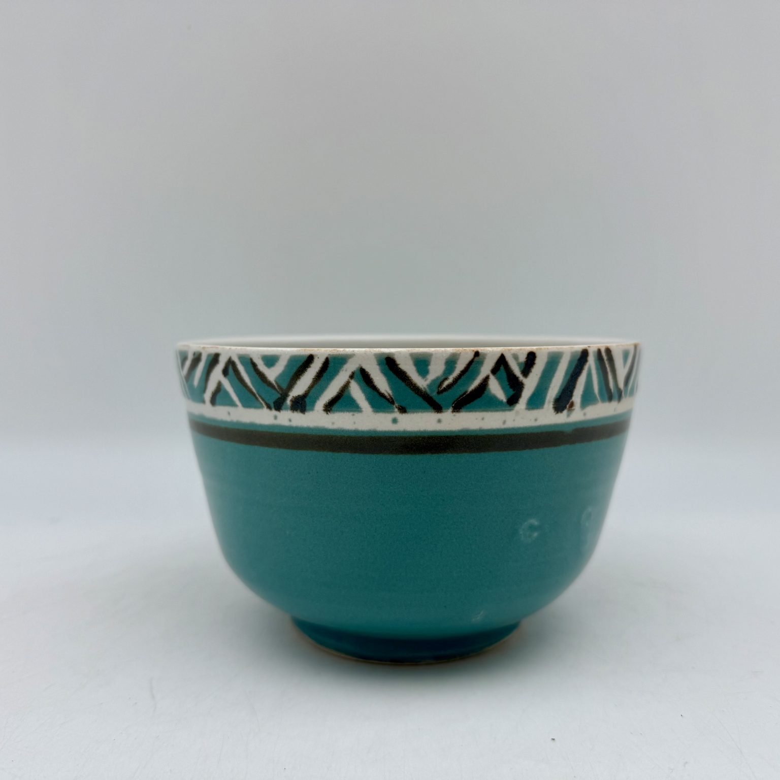 This porcelain bowl was hand-thrown by Margo Brown in Buffalo, Wyoming. Height: 3.75″ Diameter: 6″ Color: Turquoise, Black, White Dishwasher safe.