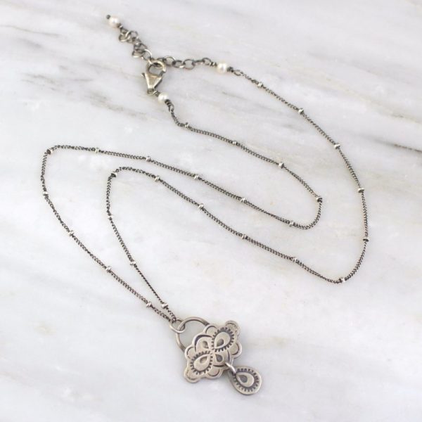 Everyday elegance. A duo of hand-stamped peacock-inspired designs. Delicate and elegant. Measures 17″-18″ with lobster clasp and adjustable length chain closure. Sterling silver, which has been oxidized and hand polished for an antique finish. Handcrafted by Sarah DeAngelo in Lakewood, Colorado. All jewelry is shipped for free within the continental U.S. Available online only.