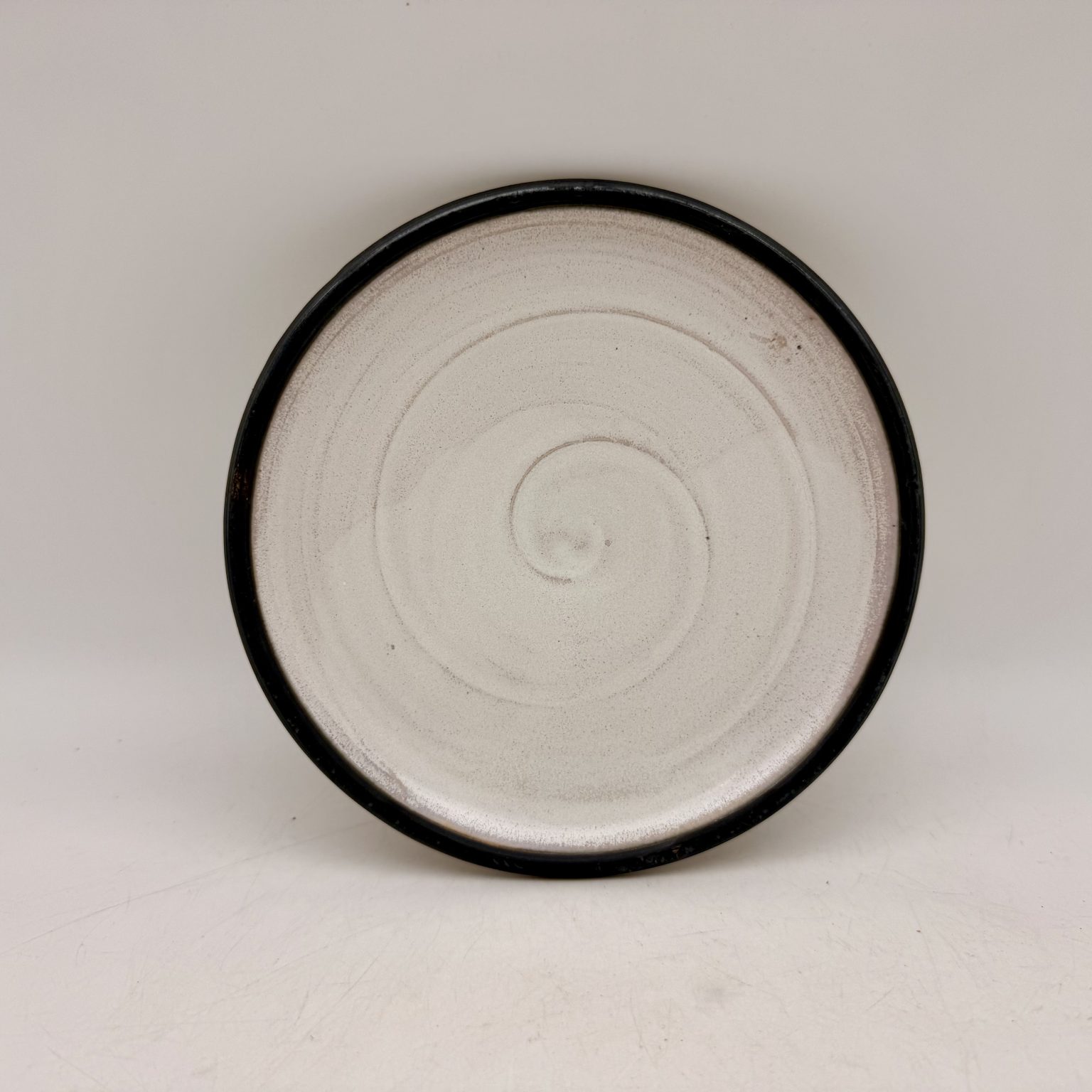 This porcelain plate was handmade by Margo Brown in Buffalo, Wyoming. Height: 1″ Diameter: 7.75″ Color: Cream, Black Dishwasher safe.