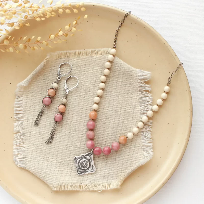 Pure happiness! Riverstone, sunstone, and rhodonite are stacked together and finished with darling tassels. This color palette is perfect for warmer weather. Leverback earwires. Measure 2 1/4”. Sterling silver, which has been oxidized and hand polished for an antique finish. Handcrafted by Sarah DeAngelo in Lakewood, Colorado. All jewelry is shipped for free within the continental U.S. Available online only.